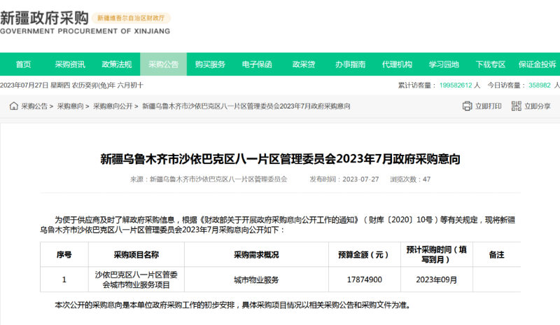 新疆政府采购消息,7月27日,乌鲁木齐市沙依巴克区同日发布五个“城市物业”项目政府采购意向,八一片区等五大片区“城市物业”项目计划2023年9月份招标采购供应商。
