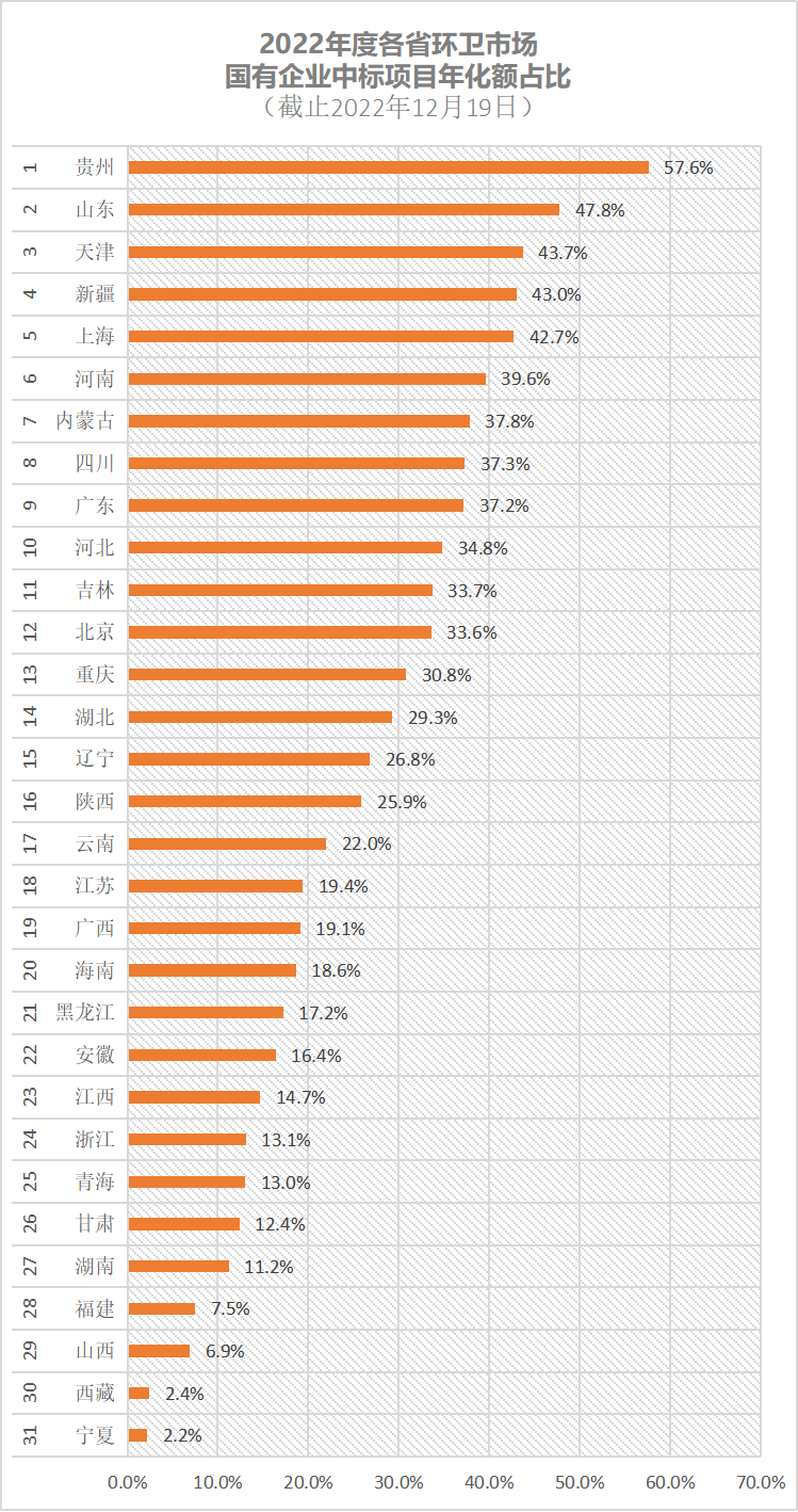 环境司南最新统计数据显示,按当年开标环卫项目年化额统计,截止12月19日,2022年度“贵州、山东、天津、新疆、上海”等五省份,国有企业中标份额占比分别为57.6%、47.8%、43.7%、43.0%、42.7%。